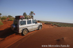 Anlässlich der Einführung des G auf dem australischen Markt und der Auferstehung des G als Rechtslenker war die Idee für die außergewöhnliche PR-Tour bei Daimler entstanden. Das war eine Chance, die ich mir nicht entgehen lassen konnte. Die Canning Stock Route ist in Australien so berühmt-berüchtigt wie in Deutschland der Nürburgring. Die 2.000 km lange Automarter ist eine Aneinanderreihung aus extrem schlechten Wellblechpisten, Felsen, Dünen und Salzseen. Sie folgt einer Viehtriebsroute aus dem 19. Jahrhundert, alle 30-80 km gibt es einen Brunnen (Well), dort sind die Rastplätze für die Traveller. Auf der Hälfte der Strecke liegt Well 33, die einzige Siedlung auf den endlosen 2.000 km roten Staubs.