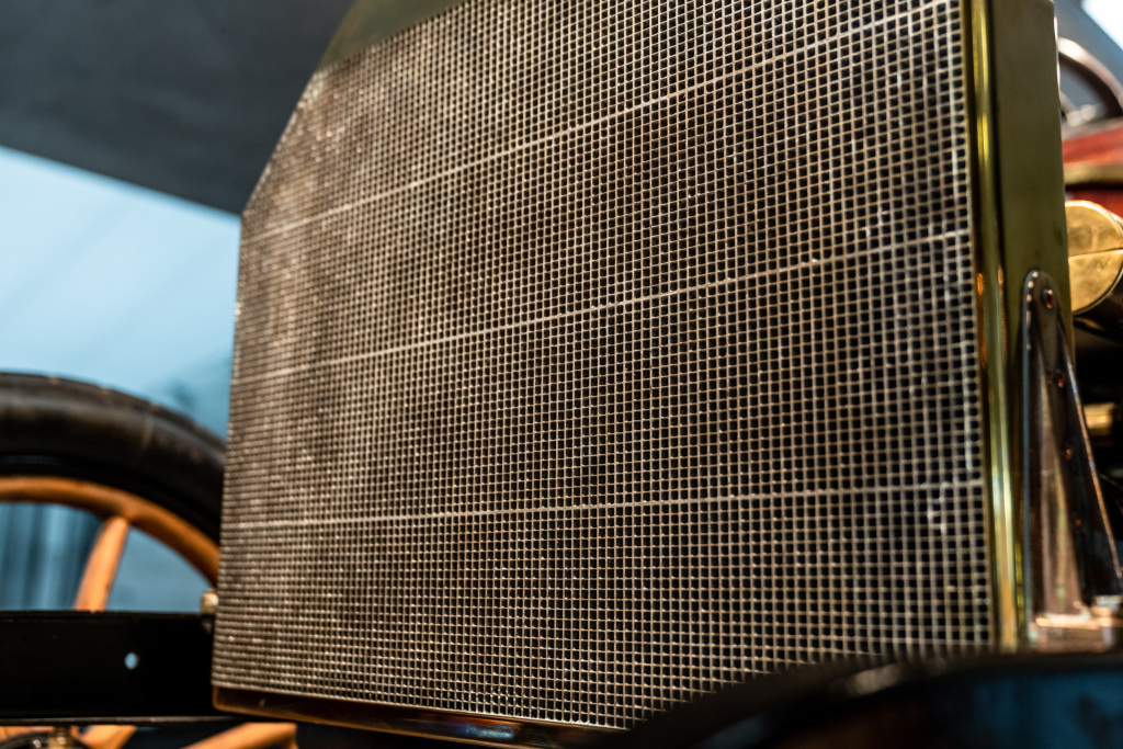 Der von Wilhelm Maybach erfundene Bienenwabenkühler. Detail eines Exponats des Mercedes-Benz Museums im Raum Mythos 2: „Mercedes – Die Geburt der Marke, 1900 bis 1914.“