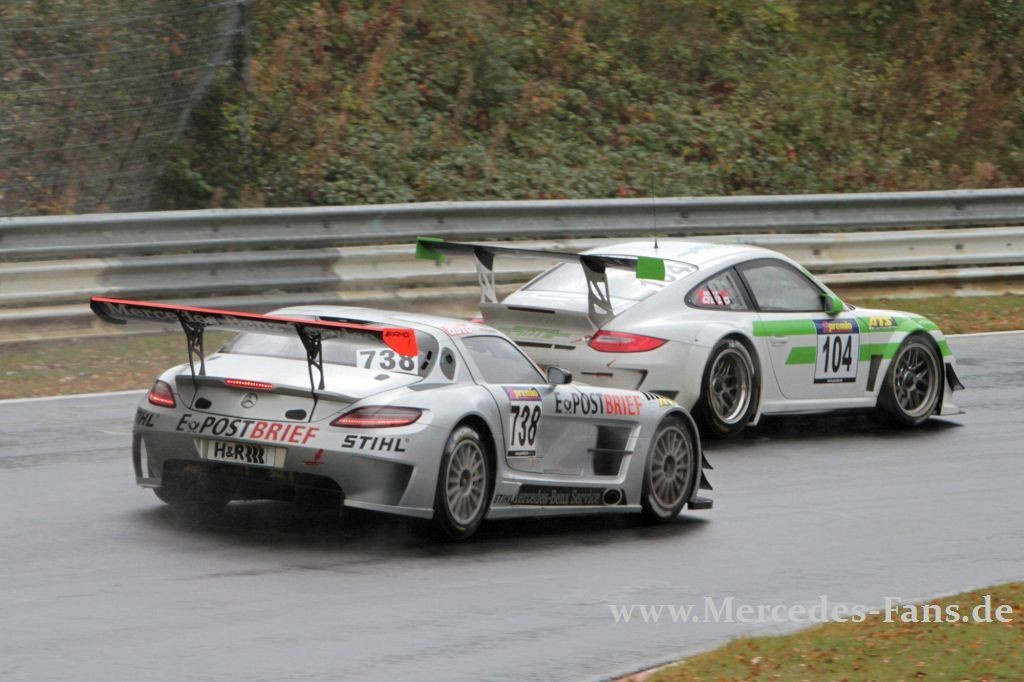 Zugegeben, das Wetter hätte besser sein können, das Ergebnis nicht. der von Platz sieben in Rennen gegangene Mercedes Benz SLS AMG, pilotiert von Thomas Jäger und Christopher Haase hat den vorletzten VLN-Lauf gewonnen. Der zweite SLS AMG (Bernd Schneider/Chris Mamerow) ging von der Pole Position ins Rennen, schied aber an den Folgen eines Unfalls aus! Die Premiere des Audi RS TT endete auf dem achten Gesamtrang - für das Auto sicher kein schlechtes Ergebnis.