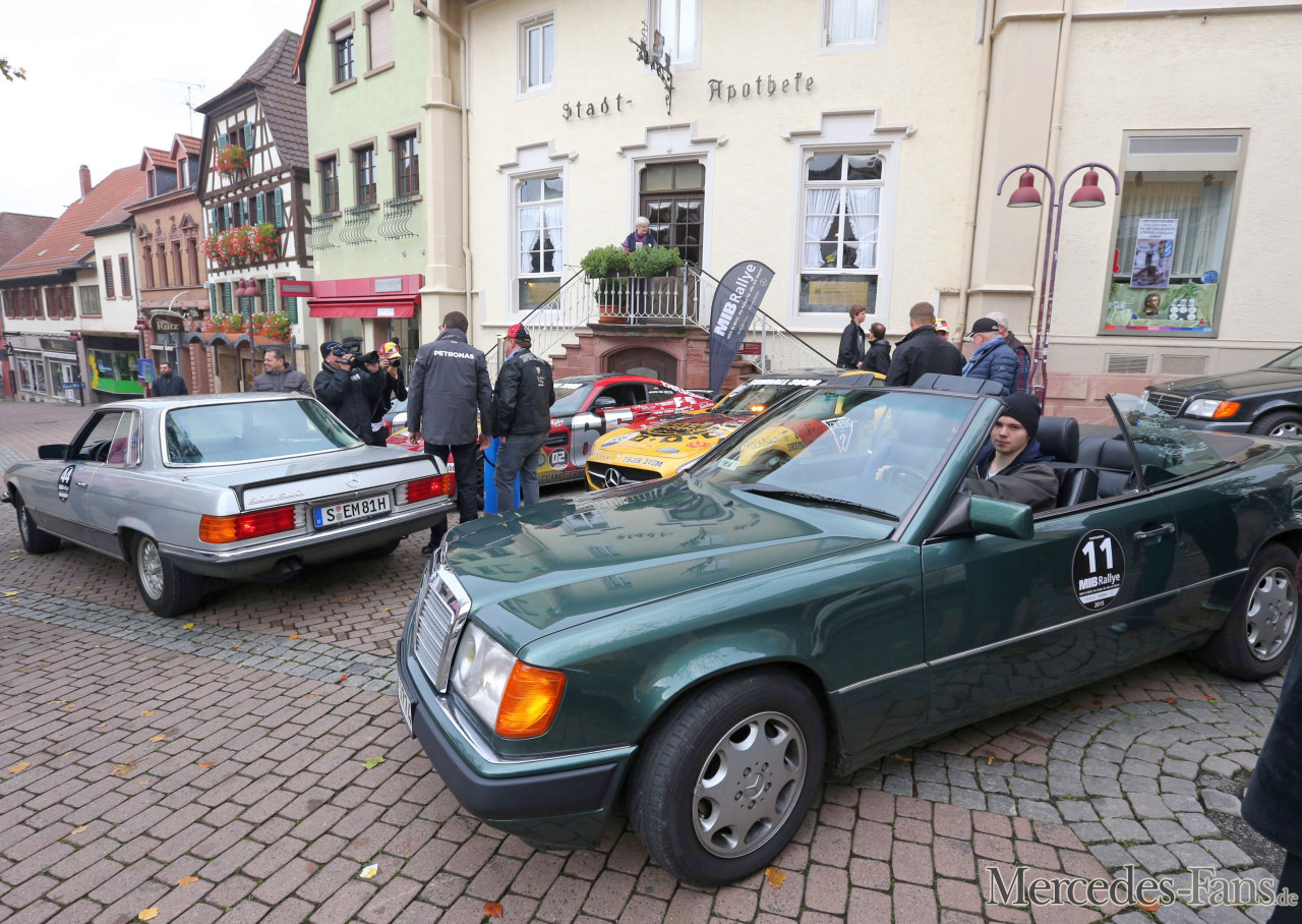 Eine Rallye nur für Mercedes-Fans. Kniffelige Aufgaben und eine schöne Streckenführung an zwei Fahrtagen – so lautete das Grundrezept für die erste MIB-Rallye. Und rückblickend dürfen wir festhalten, es hat allen Beteiligten anscheinend gut gefallen. Wobei zu ergänzen ist, das Roadbook der MIB-Rallye deutete bereits auf der zweiten Seite an, dass nicht bierernste Ergebnisjagd im Vordergrund steht: „Vergessen Sie alles, was Sie von Rallyes je zu wissen glaubten!“ Gute Laune und ein gemeinsames Erlebnis der Marke Mercedes-Benz stand bei der MIB-Rallye im Vordergrund. Dass obendrein am Sonntag in Hockenheim noch der Gewinn der DTM gefeiert werden durfte, war ein schönes – wenn auch nicht geplantes – Extra. 42 Teams mit den unterschiedlichsten Autos stürzten sich in das Abenteuer MIB-Rallye und haben es am Ende wohl auch nicht bereut. Die Palette reichte vom 220 SE Heckflosse über diverse SL/SLC der 107er Baureihe bis hin zum Gumball 3000-AMG GT-Trio oder einem raren E 60 T-Modell Einzelstück.