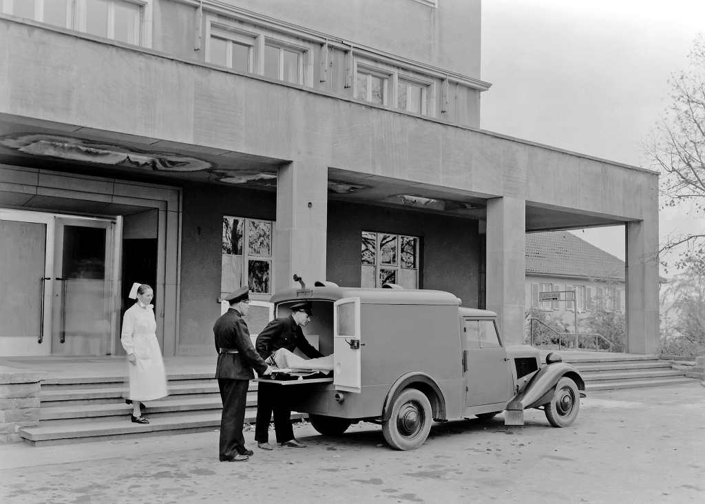 Das Foto zeigt einen Krankenwagen. Fahrzeug der ersten Ausführung mit einfachem Hägele-Fahrerhaus, aber bereits größeren Scheinwerfern.