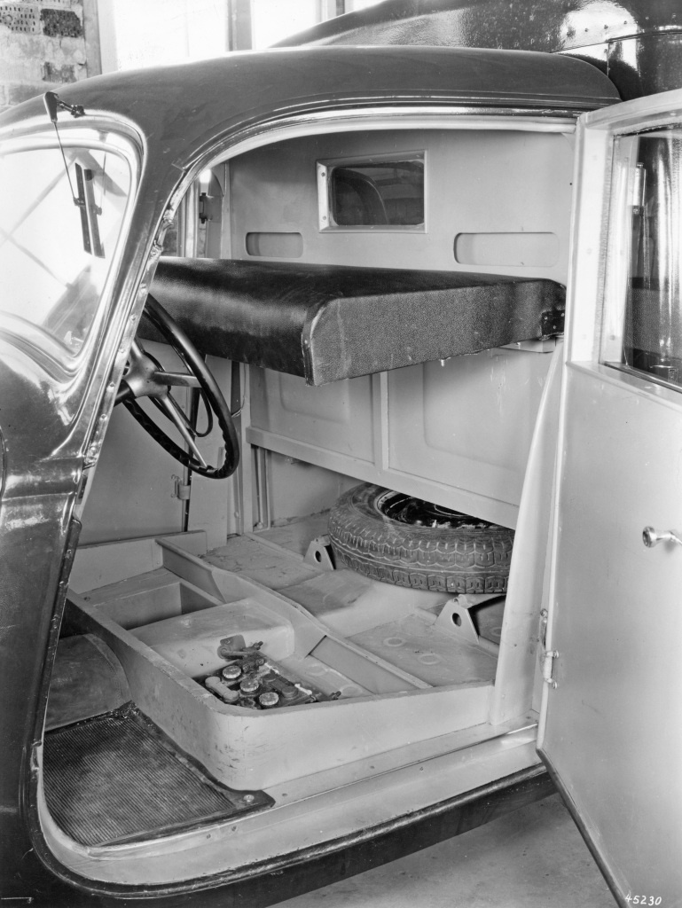 Blick auf das Interieur. Die Sitzbank kann herausgenommen und nach oben gelegt werden, damit Batterie und Ersatzrad zugänglich sind.