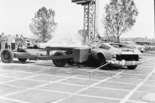Das tut schon beim Zusehen weh: Um die Crashsicherheit von Kunststoff-Karosserien zu untersuchen, opfert Mercedes-Benz einen C 111. Entwarnung für alle Mercedes-Oldtimer-Fans: Es ist nur eine C 111-Karosserie, die einem kontrollierten Seitenaufprall mittels Stoßwagen ausgesetzt wird. Weh tuts trotzdem.