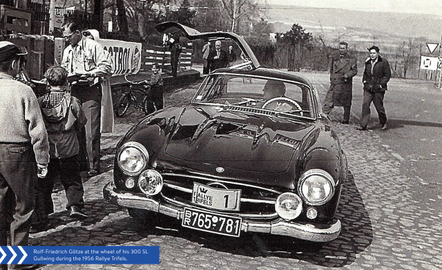 Doch was ihn wirklich besonders macht, ist seine Historie: Erstausgeliefert wurde der Benz 1956 an den deutschen Rennfahrer Rolf-Friedrich Götze, der das Fahrzeug sogleich bei der Rallye Trifels einsetzte. Götze war in den 1950er-Jahren als engagierter Privatfahrer aktiv und nutzte den 300 SL nicht nur als Statussymbol, sondern als echtes Wettbewerbsfahrzeug.