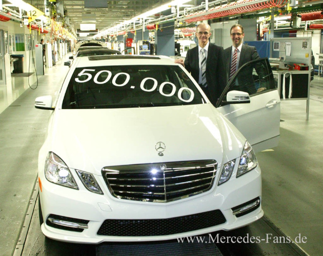 Nur knapp drei Jahre nach Produktionsstart wurde im Mercedes-Benz Werk Sindelfingen eine Bestmarke erreicht: Eine halbe Million E-Klasse Limousinen der Baureihe 212 rollten in dieser Zeit vom Band. Das Jubiläumsfahrzeug ist ein calcitweißer E 350 4MATIC mit umfangreicher Ausstattung, der für einen Kunden aus den Vereinigten Staaten produziert wurde. Neben der serienmäßigen Sicherheitsaustattung hat die Limousine zusätzlich das Spur-Paket und einen aktiven Totwinkel-Assistenten an Bord. „Die E-Klasse ist der Inbegriff einer Business-Limousine: modern, faszinierend und sicher. Das bestätigen unsere Kunden und die hohe Akzeptanz im Markt. Es freut mich besonders, dass unser Jubiläumsfahrzeug an einen überzeugten Kunden aus den Vereinigten Staaten geht“, sagte Dr. Willi Reiss, Leiter des Mercedes-Benz Werks Sindelfingen.