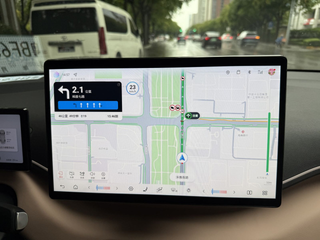 Wir machen in einem BYD Seagull, der in Deutschland als Dolphin Surf verkauft wird, die Probe aufs Exempel. Es ist ein regnerischer Tag in Xi’an. Nicht gerade die besten Voraussetzungen, um ein kamerabasiertes autonomes Fahrsystem zu testen. Auf die Frage, ob wir NOA (Navigate on Autopilot) bereits in der Stadt aktivieren dürfen, schütteln die BYD-Verantwortlichen den Kopf. „Zu viel Verkehr.“ Also warten wir, bis wir auf der Autobahn sind. Der Techniker zieht an der Wippe links an der Lenkradsäule und schon ist das System aktiv, wie man an den türkisfarbenen Dioden in den beiden Außenspiegelschalen erkennen kann. So wissen auch die anderen Verkehrsteilnehmer, dass hier ein Robo-Fahrzeug unterwegs ist. Wie bei Nios Autopilot NOP+ (Navigation on Pilot) fahren wir eine durch das Navigationssystem vorgegebene Strecke ab. Im Gegensatz zu Mercedes‘ Drive Pilot 95 benötigt der selbsttätig agierende BYD-Kleinwagen also kein Führungsfahrzeug.