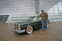 Einer der glorreichen Fünf, die Wind und Wetter trotzen, ist Timo Neuber. Der 32jährige Vollblut-Mercedes-Mechaniker kaufte seinen grünen 68er W108 als umgebauten US-Import. Jenseits des grossen Teichs wurde der Mercedes, welcher mal ein 280 SE mit Lenkradautomatik war, auf einen 200er Diesel mit manueller Schaltung umgebaut. Schuld war die Ölkrise am Anfang der 70er Jahre. Ein am Fraunhofer Institut beschäftigter Professor kümmerte sich um die Überführung. Zum Jahrtausendwechsel bekam die Limousine eine aufwändige Restaurierung. Bilstein Federn und neue Stoßdämpfer sorgen für eine satte Strassenlage. Die 16 Zoll Dunlop Bereifung kommt stilecht mit Weisswandringen daher.