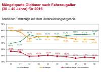 Ein Blick auf die Mängelquoten des Jahres 2016 macht die Unterschiede der einzelnen Altersklassen deutlich: Bei Pkw von sieben bis neun Jahren sind rund 33 Prozent der Fahrzeuge mit Mängeln unterwegs. Bei 10 bis 19 Jahren schnellen die Mängelzahlen rasant in die Höhe. Hier finden die Prüfingenieure der GTÜ bei rund 65 Prozent der Fahrzeuge Mängel. Bei den 20 bis 29 Jahre alten Pkw – den Youngtimern – ist der Zenit bereits überschritten und die Mängel gehen wieder leicht zurück. Hier weisen rund 60 Prozent der untersuchten Pkw Mängel auf.