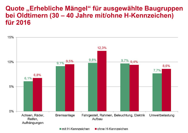 Bei den von der GTÜ im Jahr 2016 im Rahmen der HU untersuchten Oldtimern stellten die Prüfingenieure am häufigsten Mängel in den Baugruppen „Fahrgestell, Rahmen und Aufbau“, „Beleuchtung und Elektrik“, „Bremsanlage“ und bei der „Umweltbelastung“ fest.