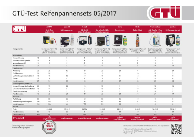 Die GTÜ Gesellschaft für Technische Überwachung hat acht Reparatur-Kits zur Behebung einer Reifenpanne geprüft. Testsieger mit dem Prädikat "sehr empfehlenswert" wurde das ResQ Tire Mobility Kit von airMAN. Für knapp 50 Euro bietet es einen 180-Watt-Kompressor und eine 450-ml-Druckflasche mit Naturkautschuk als Dichtmittel. Der Kompressor pumpt in einem Arbeitsgang das Dichtmittel in den Reifen und sollte bei Stichverletzungen von nicht mehr als 6 Millimeter Durchmesser im Bereich der Lauffläche den erforderlichen Reifendruck liefern, um notfalls bis zu 200 Kilometer weit zur nächsten Werkstatt zu kommen.