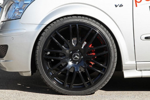 Zur Optimierung der Fahrdynamik wurde ein Paket geschnürt, das einerseits ein KTW Tuning Gewindefahrwerk beinhaltet, andererseits sorgt eine spektakuläre Rad-Reifen-Kombination nämlich KTW Tuning Leichtmetallfelgen in rundum 9,5x22 Zoll, an der Vorderachse mit 255/30ZR22 bereift und an der Hinterachse mit 285/25ZR22 für eine angemessen-imposante Schnittstelle zwischen Auto und Asphalt. Die roten Bremssättel hinter den Felgen sind ebenso unübersehbar wie perfekt kontrastierend zum Silbermetallic der Viano-Außenhaut.