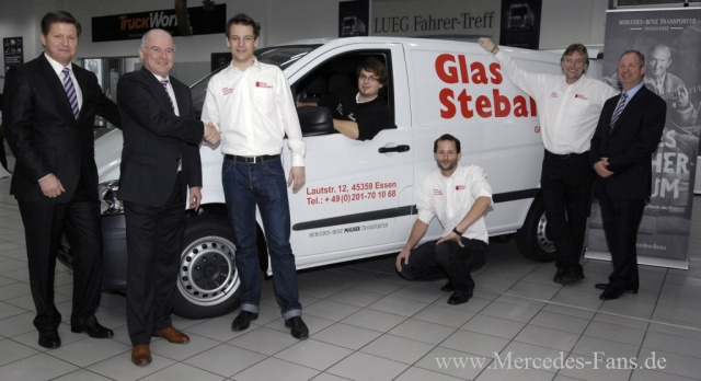Im Rahmen des MACHER-Wettbewerbs von Mercedes-Benz Transporter hat Glas Stebani aus Essen einen Mercedes-Benz Vito als neuen Firmenwagen gewonnen. Der Glasereifachbetrieb wurde vom Sänger und Comedian Mike Krüger unter den mehr als 700 Handwerksbetrieben ausgelost, die mit kreativen Fotos und frechen Sprüchen ihre Macher-Qualitäten unter Beweis gestellt hatten. Jürgen Tauscher, Vorstandsvorsitzender der Fahrzeug-Werke LUEG AG, übergab heute den in den Firmenfarben gestalteten Vito. Tim Stebani und seine Mitarbeiter haben sich als echte Macher erwiesen. Wir gratulieren Glas Stebani herzlich zum neuen Mercedes-Benz Vito und wünschen gute Fahrt, sagte Jürgen Tauscher bei der Schlüsselübergabe im Mercedes-Benz Nutzfahrzeug-Center LUEG in Bochum-Wattenscheid.
