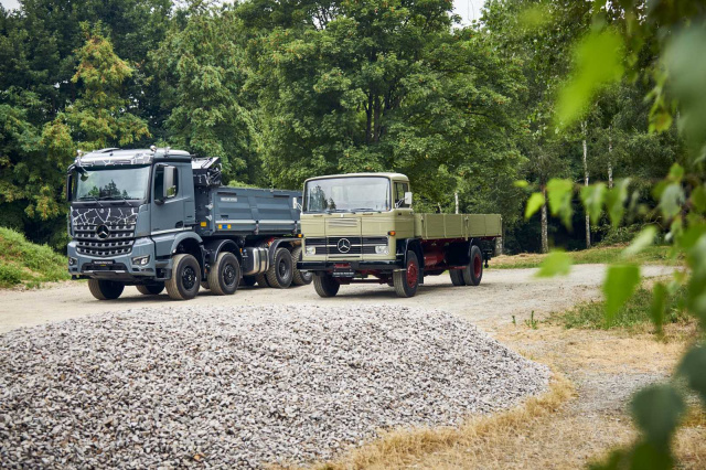 Die Arocs-Baureihe wurde für härteste Anforderungen im Materialtransport, Tiefbau und im Offroad-Bereich entwickelt. Ihr verwindungsfähiges Rahmenkonzept ermöglicht hohe Zuladungen und vielfältige Aufbauten. Dank eines breiten Radformelangebots (4x2 bis 8x8) und leistungsstarker Euro-VI-Motoren (OM 470, OM 471, OM 473 mit bis zu 460 kW) bietet der Arocs maximale Anpassungsfähigkeit. Unterstützt wird dies durch Technologien wie das Automatikgetriebe Powershift Advanced, den zuschaltbaren Hydraulic Auxiliary Drive (HAD) für zusätzliche Traktion sowie die verschleißfreie Turbo-Retarder-Kupplung. Moderne Assistenzsysteme wie der Active Brake Assist 6, Active Sideguard Assist 2 und LED-Scheinwerfer mit optionalem Steinschlagschutz sorgen für hohe Sicherheit auf und abseits der Straße. Zusätzlich steigert das digitale Cockpit „Multimedia Cockpit Interactive 2“ mit TruckLive die Effizienz und Konnektivität im Flotteneinsatz.