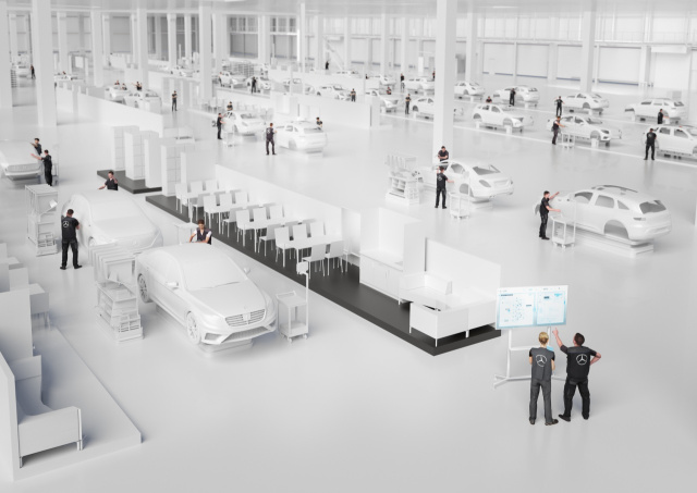Dabei sind Maschinen und Anlagen miteinander vernetzt. Ausgewählte Montageanlagen und die Fördertechnik werden Internet of Things-fähig. Die Basis dafür bildet ein leistungsfähiges WLAN- und Mobilfunknetz. Erstmals soll in Pilotanwendungen der Einsatz der leistungsstarken 5G-Mobilfunktechnologie in der Montage getestet werden. Die Montagehalle wird komplett papierlos gestaltet. Die Mitarbeiter arbeiten mit Monitoren und Personal Digital Assistants (PDA). Zur Belieferung der Montagestationen werden flächendeckend Warenkörbe eingesetzt, die in einer sogenannten Pickzone mit Hilfe von intelligenten Picksystemen mit den benötigten Materialien bestückt werden. Insgesamt sind 300 Fahrerlose Transportsysteme im Einsatz. „Entstehende Daten werden gesammelt und mittels ‚Big Data‘ -Technologie ausgewertet. Die Erkenntnisse fließen direkt wieder zurück in die Produktion. Wir können damit bestehende Prozesse verbessern und zum Beispiel per ‚Predictive Maintenance‘ Anlagenstörungen vermeiden. Damit erhöhen wir unsere Betriebsnutzungszeiten und verbessern den Reifegrad von Anfang an“, betont Schäfer.