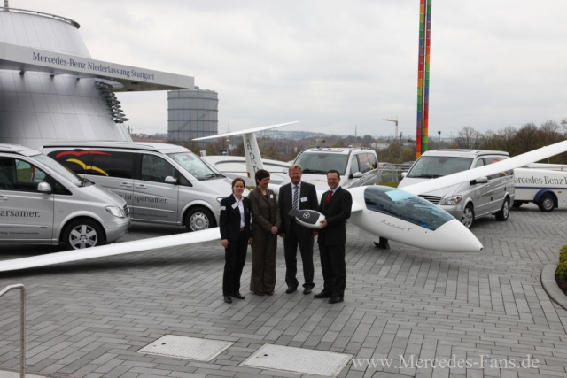 Susanne Schödel, Segelflugweltmeisterin von 2009, übernahm heute stellvertretend für das Team Germany in der Mercedes-Benz Niederlassung Stuttgart vier Fahrzeuge von Thomas Urbach, Mitglied der Geschäftsleitung des Mercedes-Benz Vertrieb Deutschland (MBVD) und verantwortlich für den Vertrieb Transporter. Die Mercedes-Benz Flotte für das deutsche Segelflug-Nationalteam umfasst drei Viano Marco Polo und einen Viano. "Fahrzeuge von Mercedes-Benz überzeugen traditionell durch Eleganz, Ausdauer und Ästhetik. Mit ihrer Umweltverträglichkeit setzen sie ein Zeichen für Nachhaltigkeit - Attribute, die auch das Segelfliegen auszeichnen und zu einem faszinierenden Sport machen", so Thomas Urbach bei der Fahrzeugübergabe. "Wir freuen uns über die neuen 'Mitglieder' im Team Germany. Gleich zwei Segelflugweltmeisterschaften in der Slowakei und in Ungarn stehen in diesem Jahr auf unserer Agenda, da werden wir die Viano gleich auf Herz und Nieren prüfen", so die mehrfach prämierte Ausnahmefliegerin, Susanne Schödel. Die gute Fahrt dürfte kein Problem sein. Bleibt noch der gute Flug zu wünschen übrig.