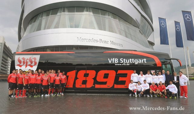 Fünf Wochen vor dem Start der neuen Bundesliga-Saison gab es für die Fußball-Profis des VfB Stuttgart ein Highlight. Hartmut Schick, Leiter Daimler Buses, überreichte VfB-Präsident Gerd E. Mäuser,- und der gesamten Mannschaft des VfB Stuttgart vor dem Mercedes-Benz Museum in Stuttgart den neuen Mannschaftsbus, einen Mercedes-Benz Travego Edition 1. Wir freuen uns sehr, dem VfB Stuttgart seinen neuen Mannschaftsbus aus dem Hause Mercedes-Benz überreichen zu dürfen. Dieser ist nicht nur sehr komfortabel, sondern auch sicher und umweltfreundlich genau das Richtige für den VfB Stuttgart, erklärt Hartmut Schick nach der Übergabe.
