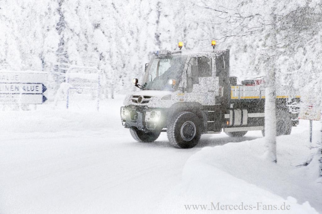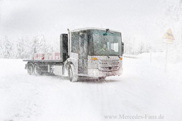 Noch in getarntem Zustand erreichen die Redaktion von Mercedes-Fan.de offizielle Fotos vom neuen Mercedes-Benz Econic, einem neuen hochgeländegänigigen Unimog und einem neuen Unimog Geräteträger. Die Bilder sind bei Testfahrten ibei minus 30 Grad Celsius am Polarkreis entstanden. Die Erprobung unter extrem wimterlichen Bedingungen dient vor allem der Optimierung Verbrauchswerte.