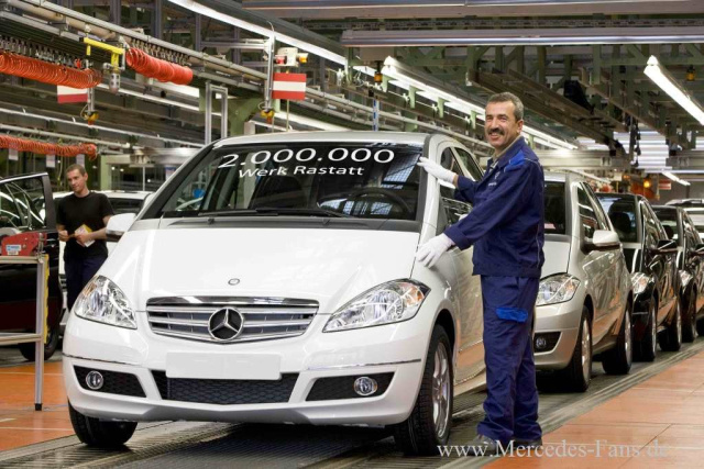 Glückwunsch: Mercedes ist zweifacher A-Klasse Millionär. Wir sind stolz auf zwei Millionen A-Klassen - Das Jubiläums-Fahrzeug ist für unser Werk ein ganz besonderes, betont der Rastatter Werkleiter Peter Wesp anlässlich dieses Produktionsmeilensteins, denn es zeigt den Markterfolg des Modells und damit auch den Erfolg unseres Werkes. Die 5.300 Rastatter Mitarbeiterinnen und Mitarbeiter arbeiten jeden Tag mit vollem Engagement daran, dass jedes einzelne Fahrzeug in Top-Qualität vom Band läuft. Das Jubiläumsfahrzeug, ein zirrusweißer A 200 ist für eine Kundin in Eisenhüttenstadt bestimmt