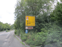 Nachdem die Straße die Ortschaft verlässt und breiter ausgebaut ist, heißt es aufpassen: Das große gelbe Bundestraßenschild mit "Gesamtverkehr rechts" über dem braunen "Route der Industriekultur"-Schild "Henrichshütte" weist die Abbiegung aus - jetzt rechts abfahren!