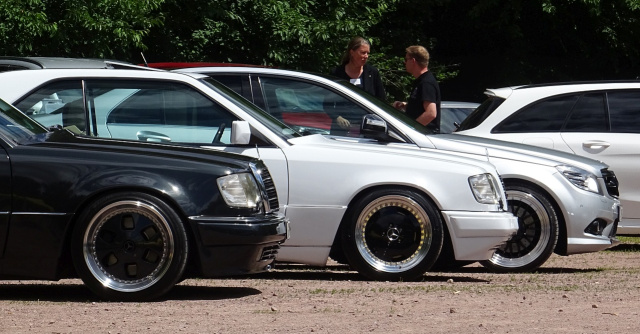 Aber zum Kernthema, den Autos. Noch mehr als im letzten Jahr konnten die Mercedes Freunde Unterfranken Brücken zwischen Generationen und Genres schlagen. Vom original erhaltenen, nach jahrzehntelangem Tiefschlaf behutsam geweckten Heckflossenbenz 220S über bildschöne 190SL und Pagoden, tolle Pontonbenz und Strich-Acht, bis hin zu aktuellen Fahrzeugen, begeisterten herausragende Exponate aus den allermeisten Mercedes-Baureihen der vergangenen 70 Jahre. Das Treffen vereinte nicht nur grundverschiedene Fahrzeuggenerationen, sondern auch gegenläufige Ansätze. Manche Fahrzeuge waren völlig original, teils aufwendig restauriert oder nicht minder aufwendig über viele Jahre und mehr oder weniger Kilometer gepflegt. Manche zeigten sich dezent oder zurückhaltend-zeitgenössisch getunt. Einige allerdings waren inklusive deutlicher Leistungssteigerungen sehr stark modifiziert. Kurzum, bei den Mercedes Freunden Unterfranken traf sich die volle Bandbreite der Mercedes Enthusiasten.