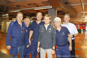 In Begleitung von Werksleiter Dr. Willi Reiss besichtigten Rosberg, Hamilton und Wolff die Produktionsanlagen der neuen Mercedes-Benz S-Klasse, die seit diesem Jahr in Sindelfingen produziert wird. Hier durften die beiden Silberpfeil-Piloten selbst ihr Geschick beweisen und die Räder einer Mercedes-Benz S-Klasse montieren. Das Montieren der Räder einer neuen S-Klasse am Band war eine neue Erfahrung für mich ich bin aber froh, dass am Rennwochenende meine Jungs in der Box die Reifenwechsel für mich übernehmen, sagte Hamilton. Sie sind darin auch sehr viel schneller als i