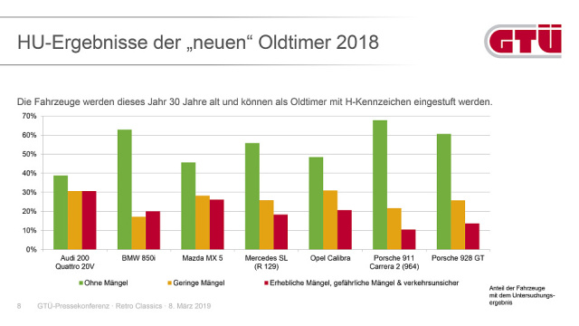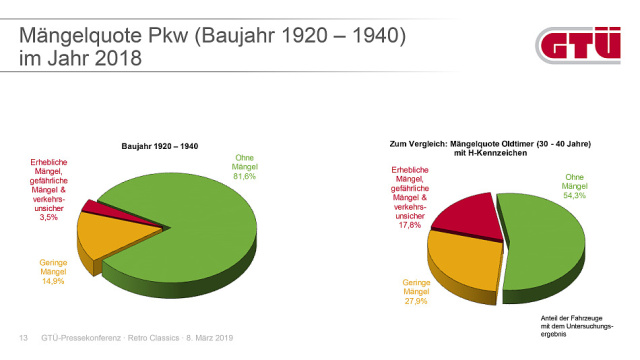 Ein völlig anderes Bild geben die Klassiker aus der Vorkriegszeit: Bei den für den Straßenverkehr zugelassenen Oldtimern der Baujahre 1920 bis 1940 sind 81,6 Prozent der Fahrzeuge in meist sehr gepflegtem Zustand und ohne jegliche Mängel. Lediglich 14,9 Prozent der historischen Fahrzeuge aus diesem Zeitraum weisen „geringe Mängel“ auf, bei nur 3,5 Prozent stellten die GTÜ-Prüfingenieure „erhebliche und gefährliche Mängel“ fest.