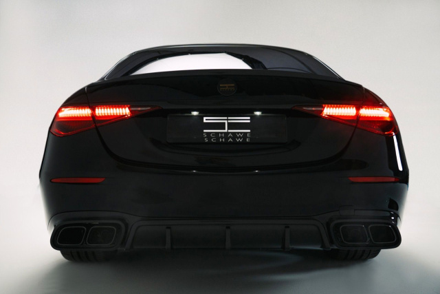 Die neue SCHAWE S-Klasse S580 in der Gold Edition ist ein echtes Einzelstück. Das Exterieur des Fahrzeugs wurde durch das umfassende SCHAWE-Designpaket auf ein neues Niveau gehoben. Ein markanter Carbon-Heckspoiler ziert die Kofferraumklappe und wird ergänzt durch einen sportlichen Carbon-Diffusor, der perfekt in die AMG-Heckschürze integriert ist. Auch die Außenspiegel sowie die Fensterrahmen präsentieren sich in hochwertigem Carbon, was dem Fahrzeug eine exklusive und dynamische Optik verleiht.